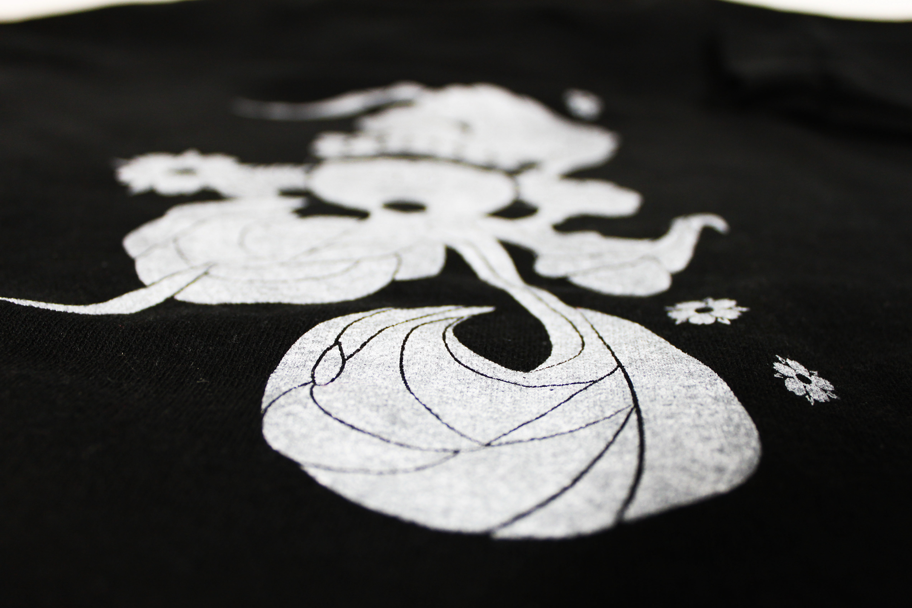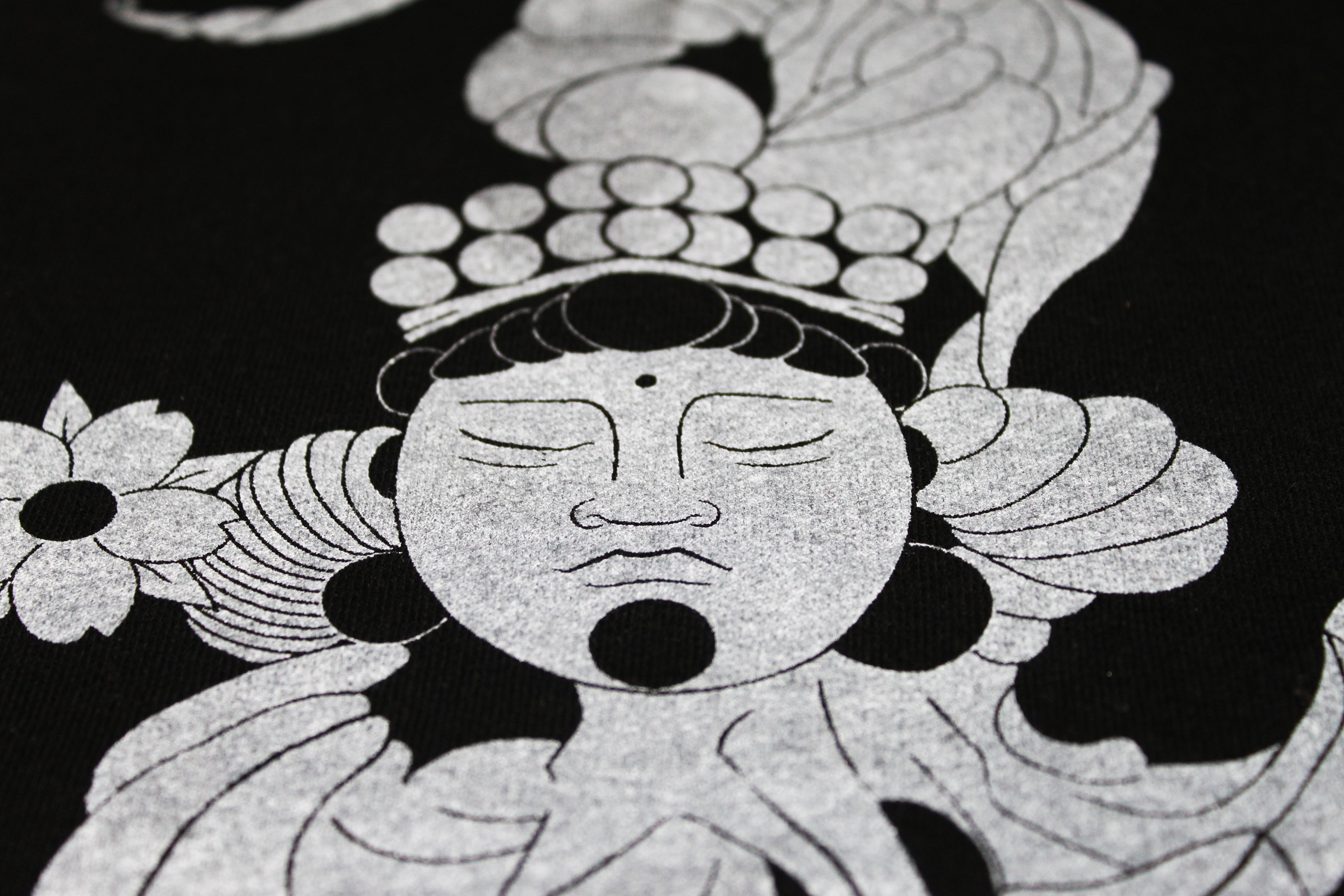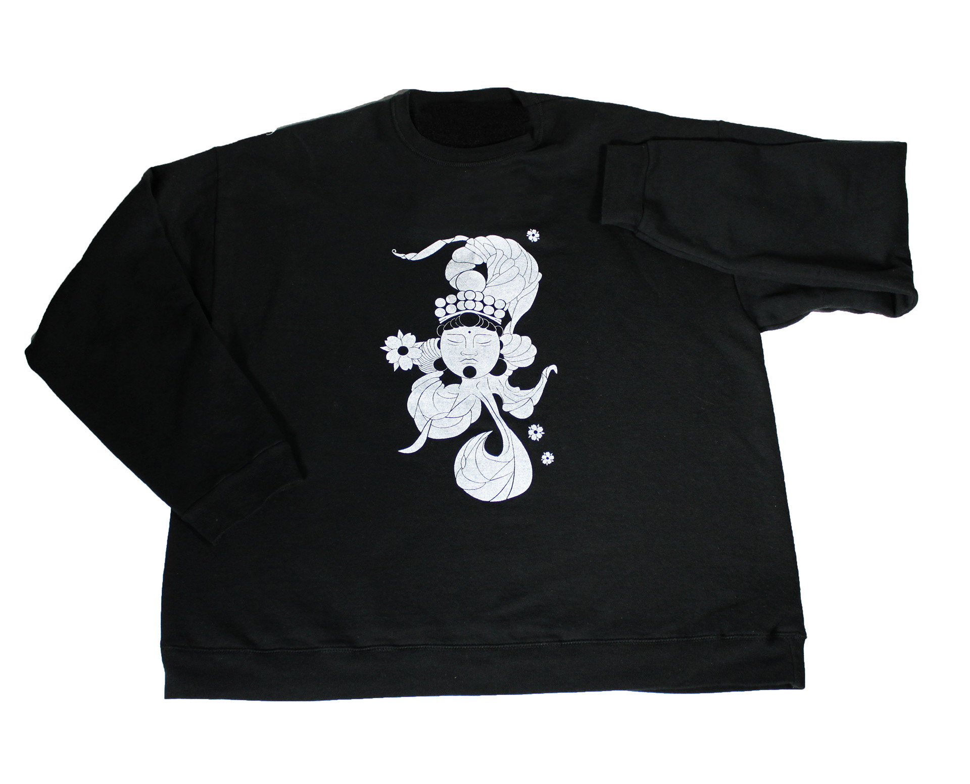 This design is based on a sketch of the Buddhist deity Guanyin and was transformed into a eloquent sweater design. The graphic was transferred to the sweater by silk screening.
